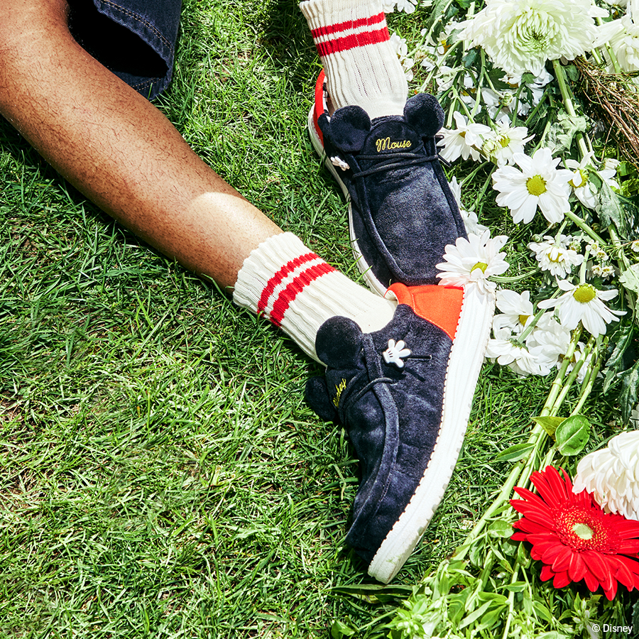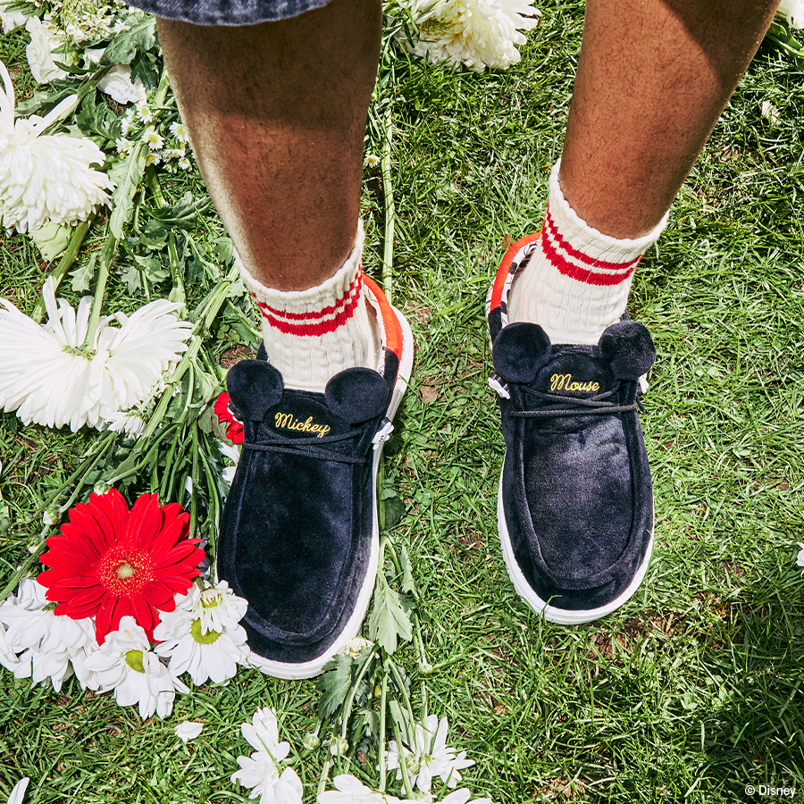 We really gave this collab shoe the white glove treatment. Disney X HEYDUDE Wally Funk Mickey features the character’s iconic coloring. a Mickey hand lace cover. Mickey ears and black and white Mickey head print lining. A truly magical shoe for men and women.